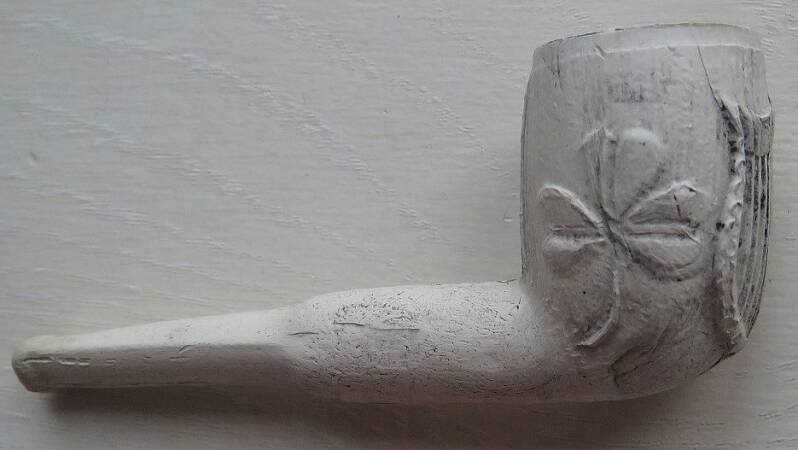 Kleipijp (Lade25FM55) Figuraal met klavertje drie en een harp (Wapen van Ierland). Engeland. 1e helft 20e eeuw.