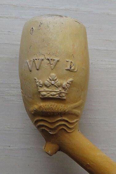 Kleipijp (Lade27FM04) Zijmerk: WVD gekroond en vis. Gorinchem. 1772-1785. Pijpenmaker: Willem van Dijk. Vindplaats: Schoonhoven