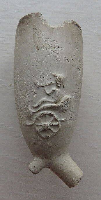 Kleipijp (Lade27FM17) Zijmerk: man in sjees pijprokend. Gouda. 1e helft 18e eeuw. Pijpenmaker: