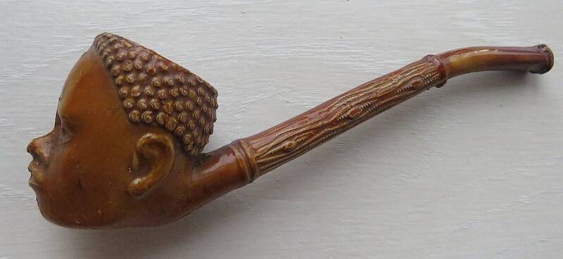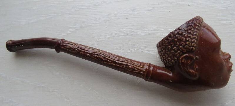 Kleipijp (Lade33FM53) figuraal met een man met kroeshaar. Pijp geglazuurd. 1920-1940. Pijpenmaker: Wilhelm Klauer.