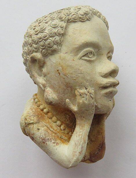Kleipijp (Lade61FM17) Figuraal met een vrouw uit Afrika ondersteund haar hoofd met haar handen . Fabriek: P. Goedewaagen.