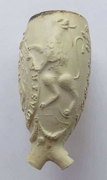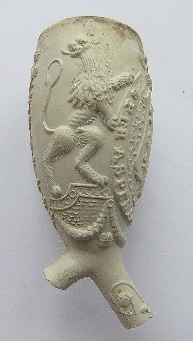 Kleipijp (Lade61FM22) met Wapen van Gouda vastgehouden door twee staande leeuwen. PER ASPERA AD ASTRA.
