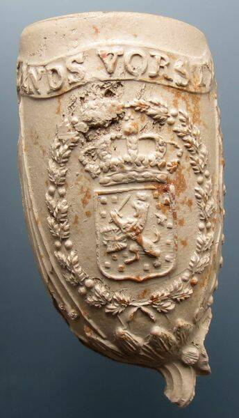 Op de ontbrekende steel heeft de tekst NEDERLAND EN ORANIE gestaan. Vindplaats: Gouda Drapiersteeg.