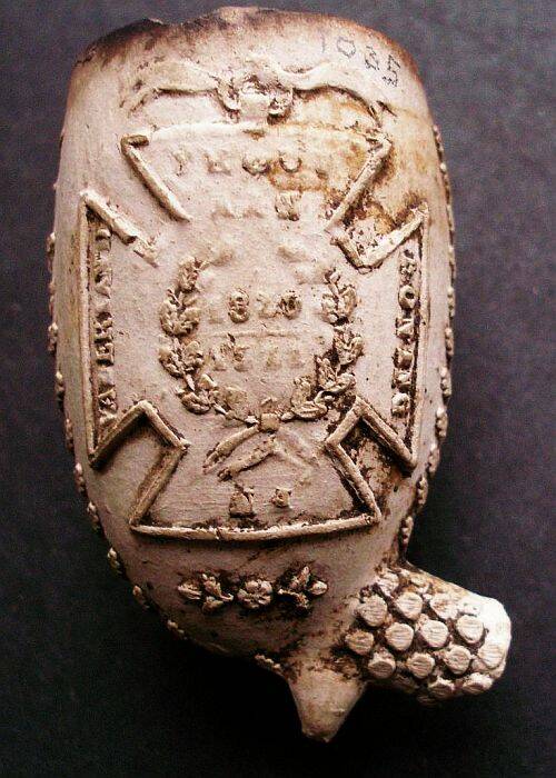 Opmerking: Door de datering op de pijp zou je de datering van pijp kort na 1831 willen plaatsen, echter het model Izabé is later gemaakt en zal het een herinneringspijp zijn van ± 1860 of later