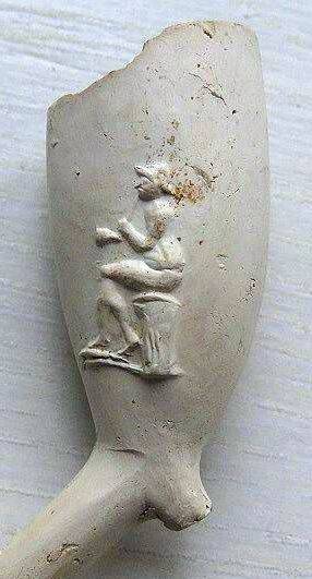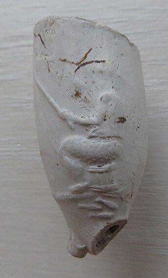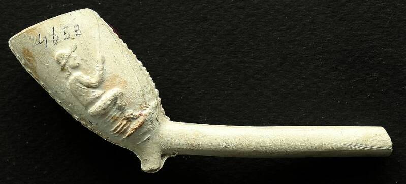 Kleipijp (lade12FM2) van het parelnaadtype met visser en poepende man.