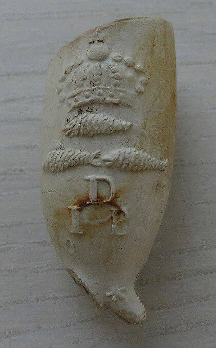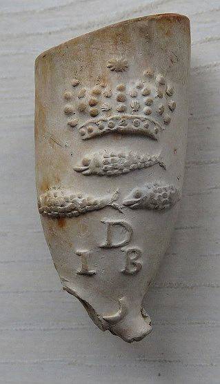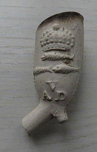 Kleipijp (Ds22FM06) met een Vissertje, AVD en drie vissen met kroon. 1700-1730. Gouda. Pijpenmaker: Arend van Dijk.