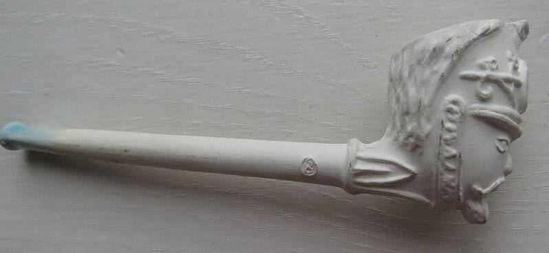 Kleipijp (lade25FM36) figuraal gezichtspijp van een soldaat, cavalerist. Op de steel de tekst: DRAGOON(=Cavalerist)