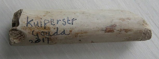 Pijpensteel (lade1FMgeennummer) lengte 12,5 cm, diameter 1,1 cm en rookopening 0,4 cm. 1699-1729. Gouda.