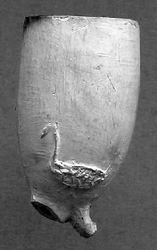 Slechte pijpenklei gebruikt. Op de breuk op de kop rechts is te zien dat er een steentje in de pijpenklei zat.