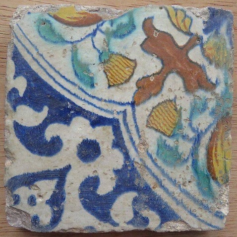 Tegel met een vogel. 17e eeuw. De tegel is aan de bovenkant gekapt maar heeft geen restauratie