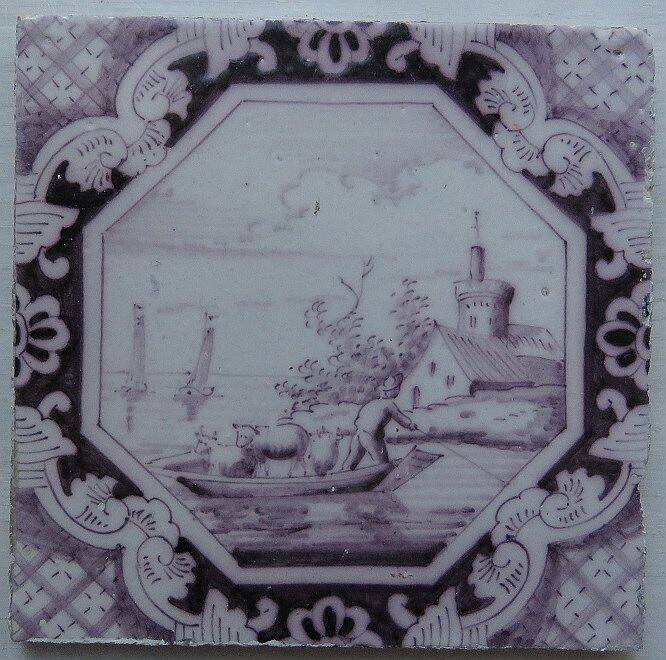 Zeldzame tegel met de voorstelling van wandelende man in landschap met schepen. Bijzonder is dat hoekvulling ontbreekt.