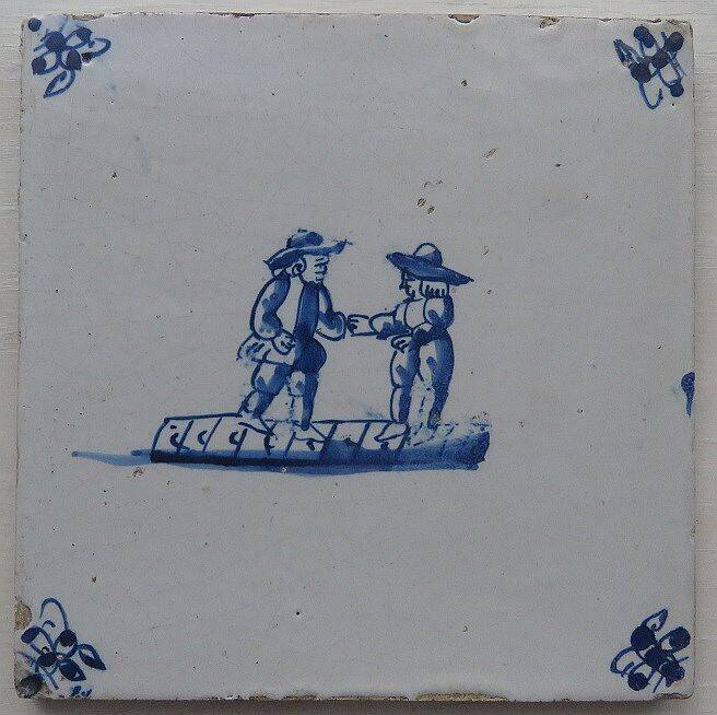 Tegel met een kinderspel. Midden 18e eeuw. De tegel heeft geen restauratie; wel een bakfoutje
