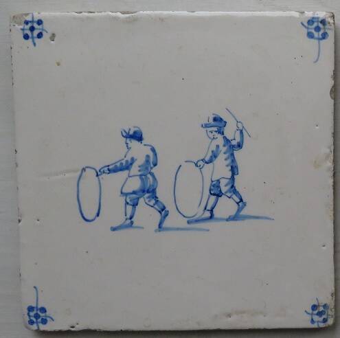 Tegel met kinderspel, hoepelen. 2e helft 19e eeuw. De tegel heeft geen restauraties.