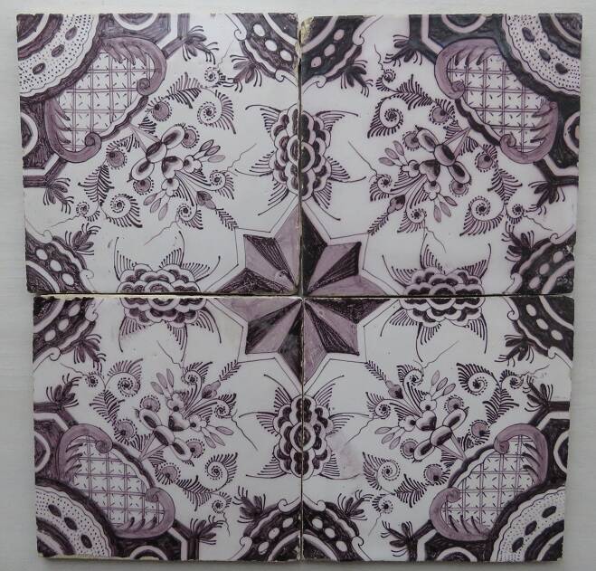 Vierpas met ornamenttegels in mangaan uitvoering. Ca. 1800. Een tegel is gebroken; op de verse breuk gelijmd.