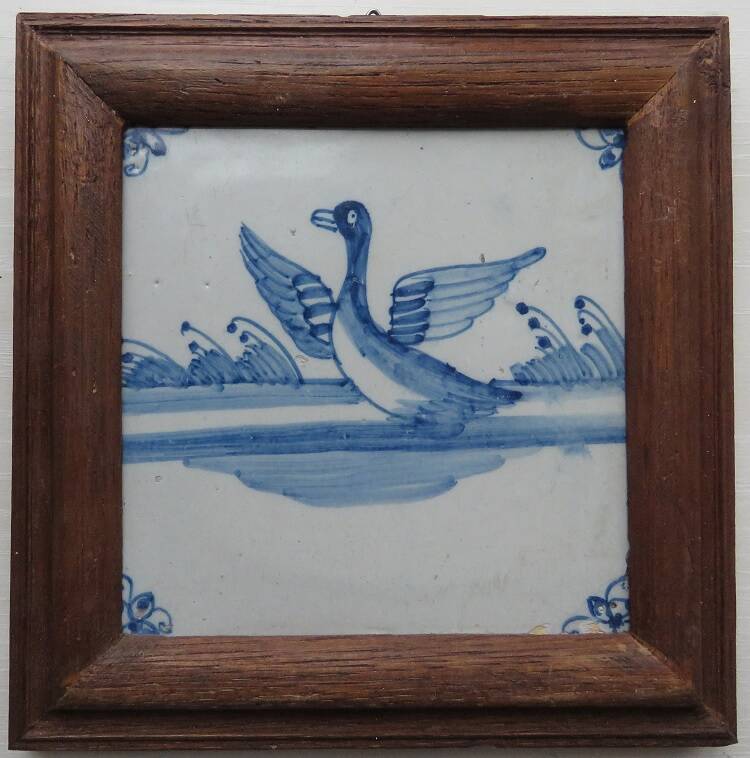 Tegel met een klapwiekende eend. In een houten lijstje. Eind 19e eeuw