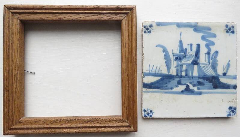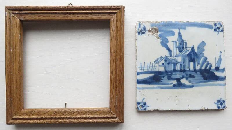 Kan met een lijstje. De tegel is gaaf, heeft alleen een glazuurbluts maar geen breuk.