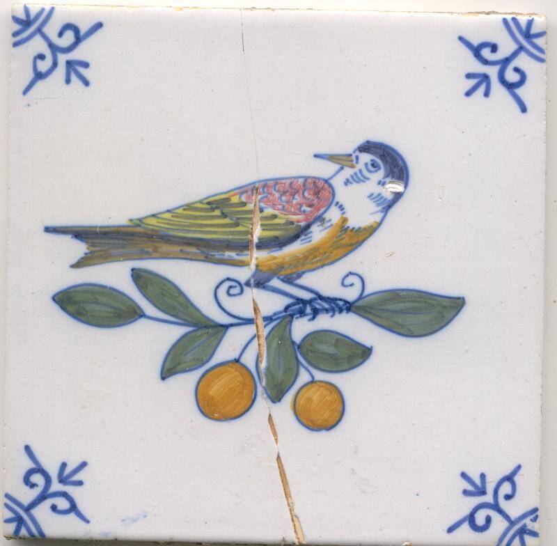 Zeldzame tegel met de voorstelling van een vogelachtige. Ca. 1910-1915. De tegel is gebroken en gelijmd.