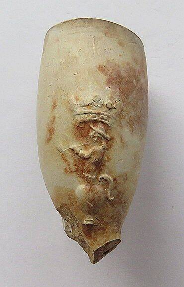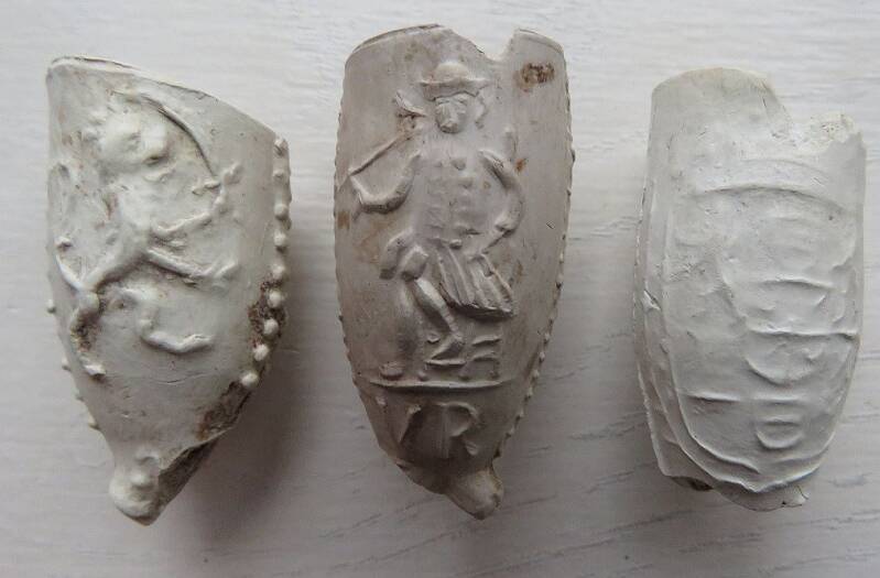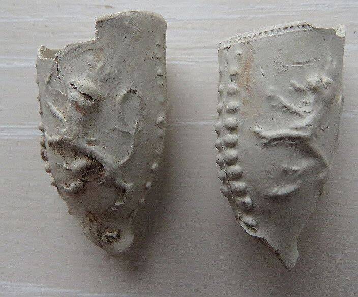 Bewerkte kleipijpjes met leeuwen. De ene leeuw met sabel en de andere zonder sabel.Gorinchem.1680/90.