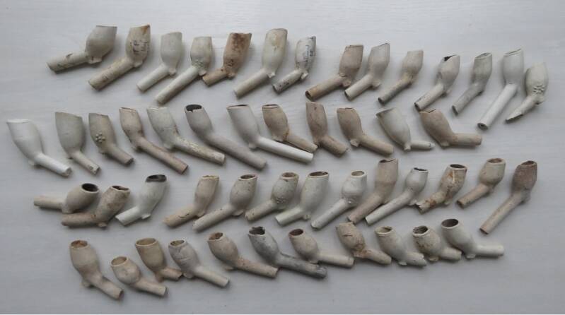Mooie groep van 28 stuks 17e eeuwse kleipijpen. Afwisseling van kopjes vrijwel zonder steel