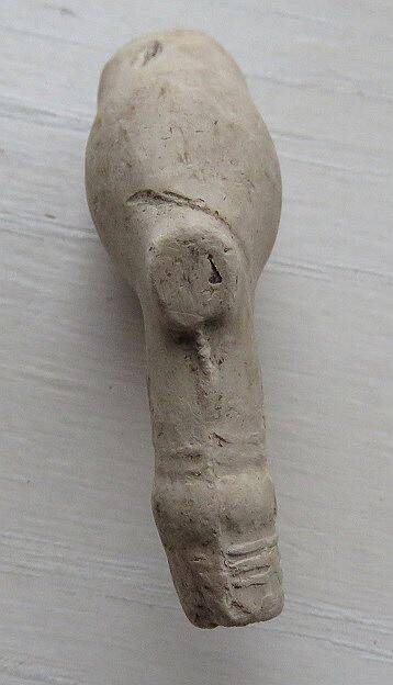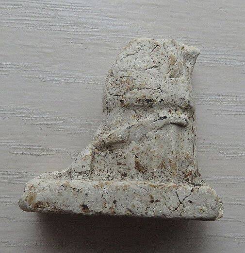 Zeldzaam. Pijpaarde beeldje met de voorstelling van persoon met een ketel in de hand. Bovenkant persoon mist. Hoogte ca. 3,5 cm.
