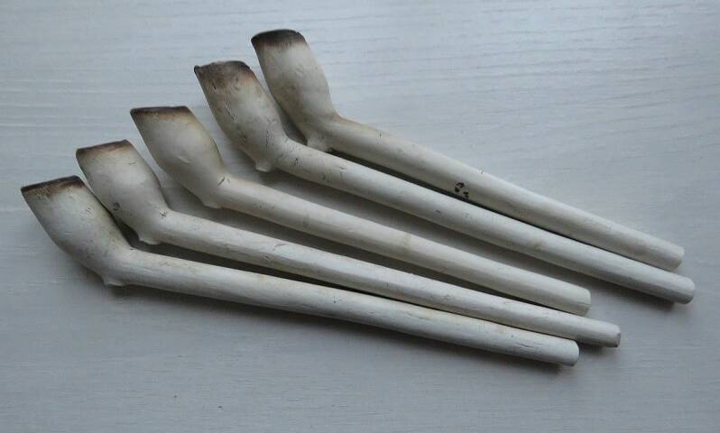 Vijf kleipijpen met mooi stuk steel van ca. 15-20 cm. Datering: Ca. 1690-1730.