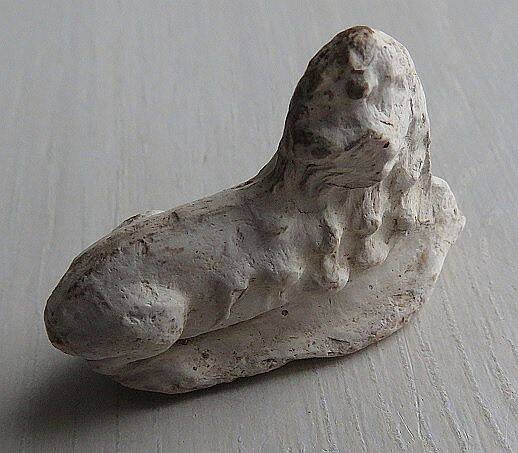 Zeldzaam. Gaaf Pijpaarde beeldje met liggende leeuw. Lengte ca. 5 cm. 17e/18e eeuw.