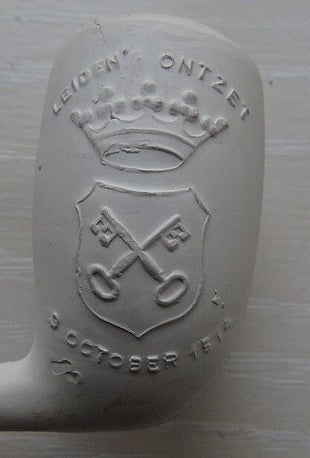 Mooie complete en zeldzame kleipijp uitgebracht ter ere van Leidens ontzet. Met op de ketel de tekst BURGEMEESTER VAN DER WERF en LEIDENS ONTZET en 3 OCTOBER 1574. Op de steel aan een kant de tekst: A.B. van der Reep v/h Franchimon. Aan de andere kant van de steel de tekst: Haarlemmerstraat 201. Pijp is puntgaaf. Datering: 2e helft 20e eeuw.
